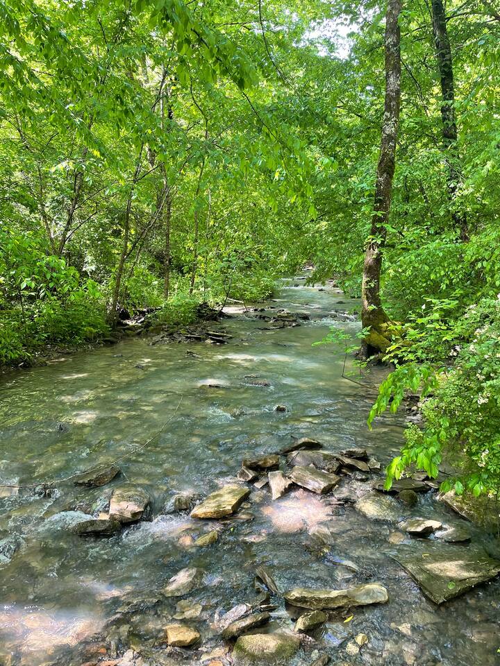 Not all escapes are found on maps; some are found in time. Tucked into a quiet hollow just about 20 minutes from Dale Hollow Lake and Lake Cumberland, this 1919 schoolhouse offers a slower summer rhythm. Sunlight filters through original wood floors, the seasonal creek hums nearby, and fireflies dance at dusk. Spend your days on the water, then return to stillness. Hidden Creek is a storybook stay you step into, not rush through. Evenings stretch long under starlit skies.